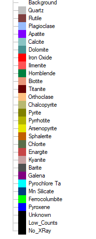 На доповнення до карти штучних кольорів. легенда мінералу показує, який мінерал відповідає кожному призначеному кольору. Хоча сама по собі легенда не є результатом MLA, вона є важливою для інтерпретації зображення зразка мінералу.