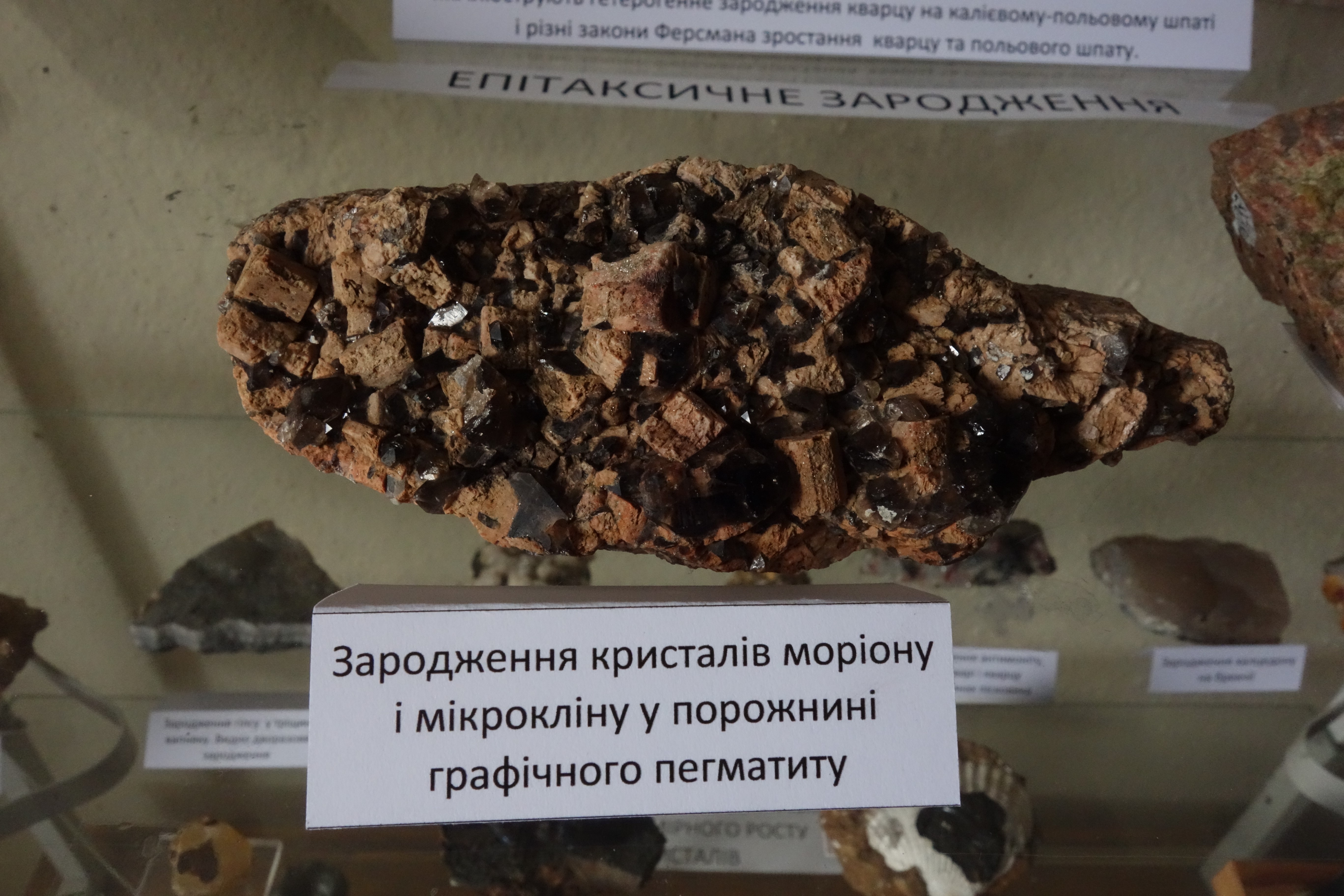 Гетерогенне зародження (мінерал на мінералі) експоновано на великому числі характерних зразків: серія експонатів графічного пегматиту (епітаксичне зародження), автоепітаксичне зародження кварцу на кварці, гетерогенне зародження кристалохімічно неспоріднених мінералів - зародження кварцу та морденіту в базальтовій порожнині, клевеландиту на мікрокліні. епідоту й кварцу в тріщинах граніту, кальциту в аметистовій жеоді, топазу на альбіті, конкреційне зародження тощо.