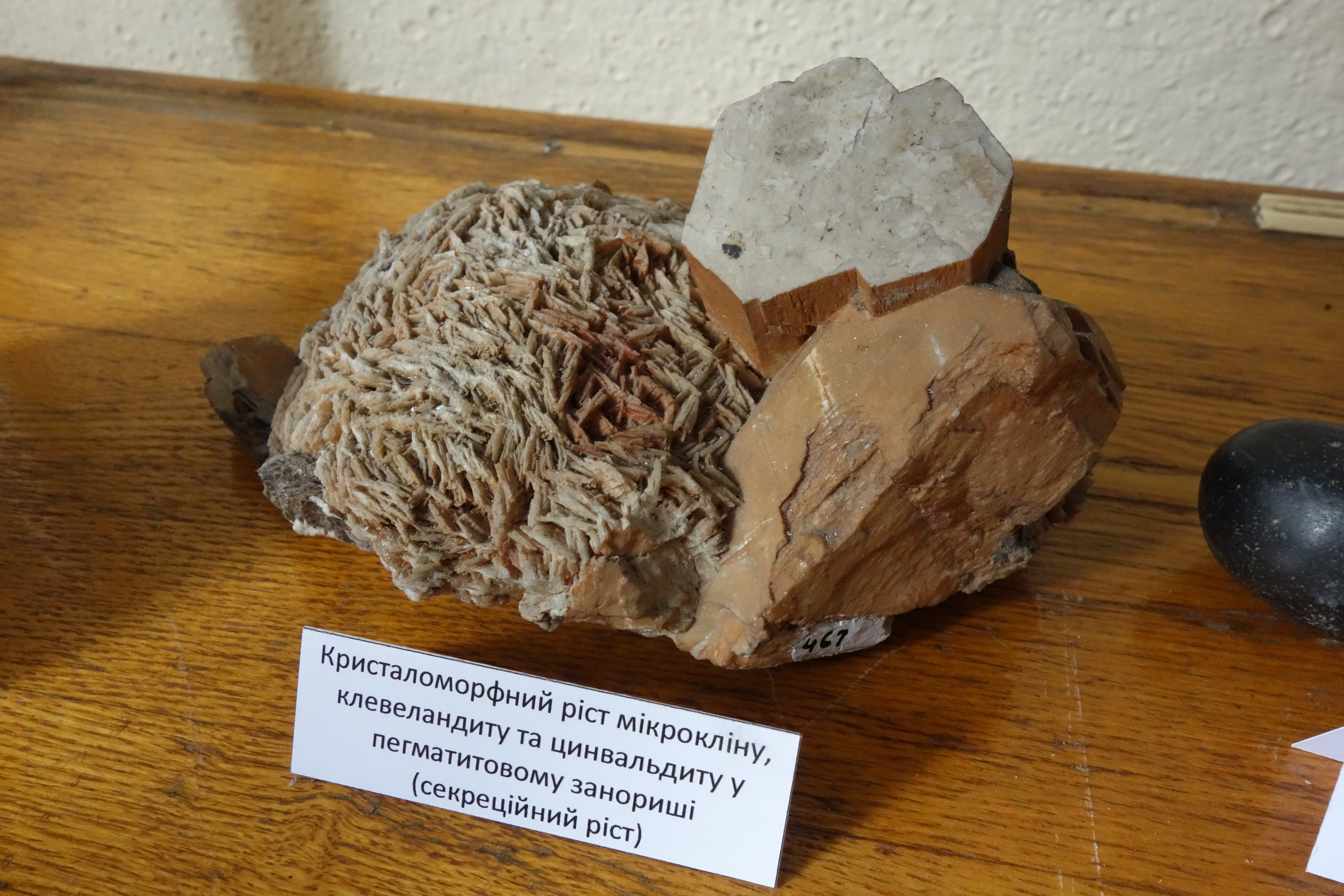 Кристаломорфний ріст мікрокліну, клевеландиту й цинвальдиту в пегматитовому занориші (секреційний ріст)