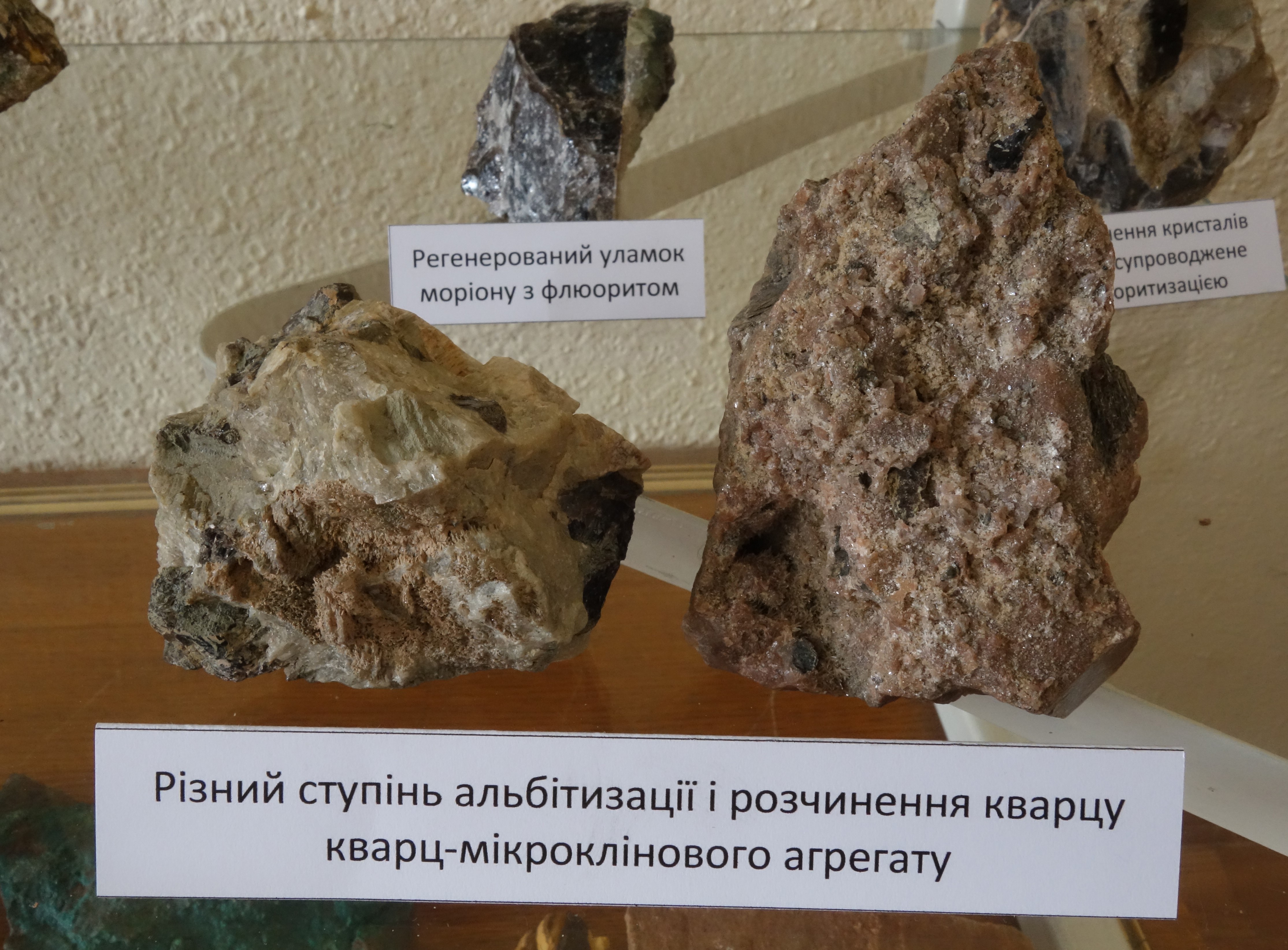 Неабиякий інтерес викликали зразки мінералогічних брекчій. які генетично відрізняються від поширених у земній корі тектонічних брекчій, псевдоморфози (гетиту по піриту, альбіту по мікрокліну, кальциту по амоніту), гідрослюдизація цинвальдиту, перекристалізація мінералів (гіпс, мармур), гідрослюдизація (вермикулізація) біотиту, сильна хімічна зміна сульфідів міді.