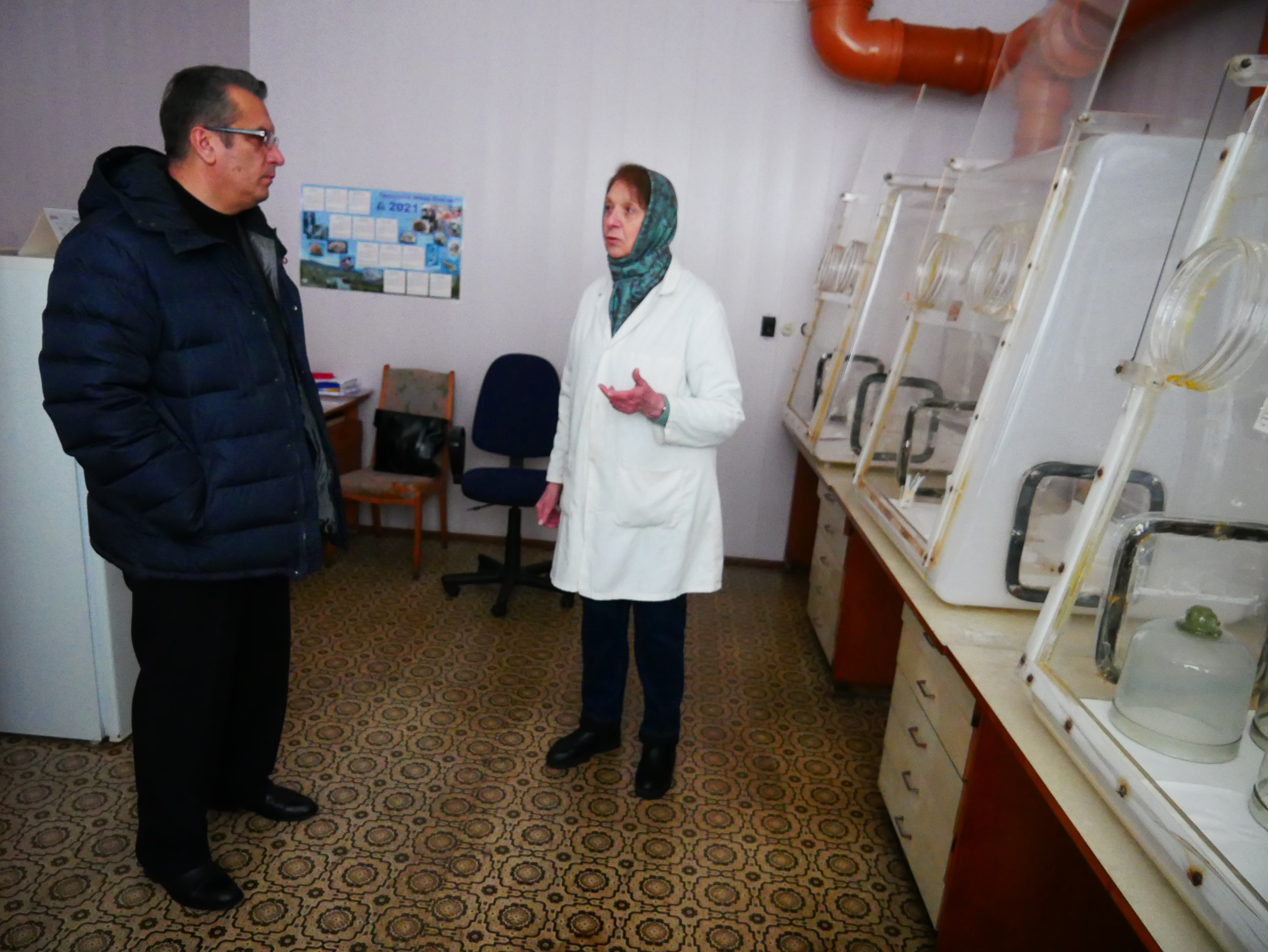У лабораторії ізотопної геології відділу радіогеохронології. Науковий співробітник відділу Тетяна Довбуш розповідає віце-президенту НАН України академіку В'ячеславу Богданову про особливості роботи та проблеми лабораторії.